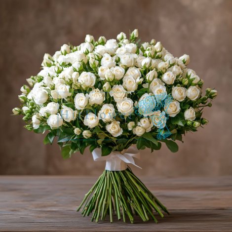 Этот изысканный букет белых кустовых роз — символ чистоты и нежности. Каждая роза, словно маленькое произведение искусства, поражает своей утонченной формой и бархатистой текстурой лепестков. Их мягкий белый цвет создает атмосферу спокойствия и умиротворения, идеально подходя для самых различных событий — от романтического свидания до торжественного мероприятия. Букет дополнен нежной зеленью, которая подчеркивает красоту роз и придает композиции объем. Легкая ароматика цветов наполняет пространство свежестью, создавая ощущение весеннего утра. Этот букет станет прекрасным подарком для любимого человека, а также станет стильным акцентом в интерьере, добавляя нотку элегантности и изящества.
